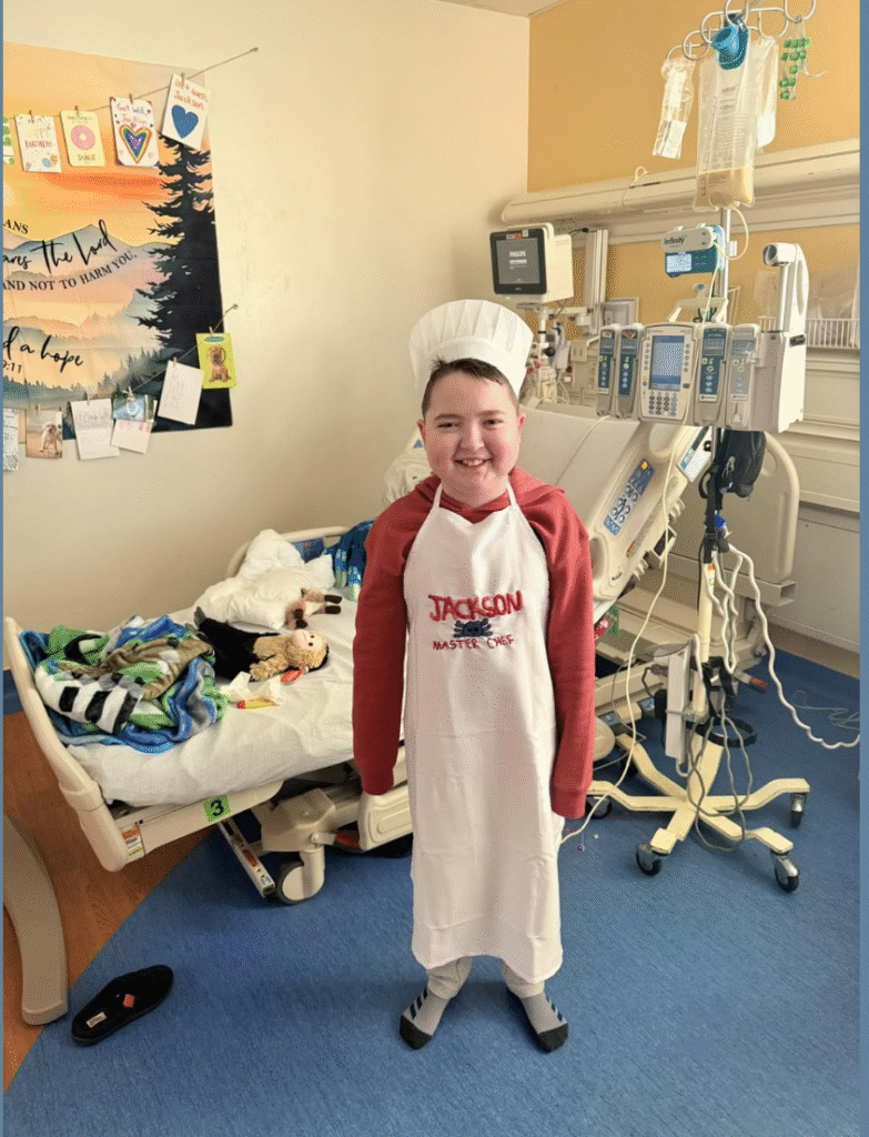 PT and OT have been a huge part of Jackson’s preparation and recovery for surgery. He works five days a week to build muscle and master skills he lost from being sick the last several years. Mrs. Julia and Ms. Kelsey hold a special place in our hearts and are the bright spot in his day. Since Jackson has taken a liking to cooking his own food, Ms. Kelsey hand stitched him his own apron, complete with his favorite Minecraft animal, and axolotl. He’s the cutest chef around by far!