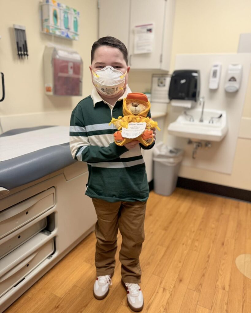 Day 2 – Our leash is not long right now, so we are back for check in with Dr. Mo. All of the transplant kids get a bear to decorate and hang in the hallway of the transplant floor of the hospital. We’ve walked by everyone’s bears for the past few years and are so happy to be adding Jackson’s bear to the collection. Each bear is a life forever changed!