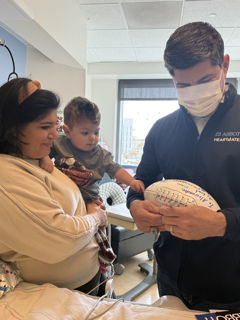 On February 11, Teddy Bruschi a former NFL Super Bowl Champion for the New England Patrios visited Alessandro. Teddy is a two time stroke survivor and shared a very funny facetime moment with Dad and his coworker while visiting Alessandros room. He signed a footbal for Alessandro and he was even brave enough to let him hold his Super Bowl Ring! Alessandro didn’t find the ring interesting so he dropped it right away, thankfully right on to the crib. No harm No Foul.