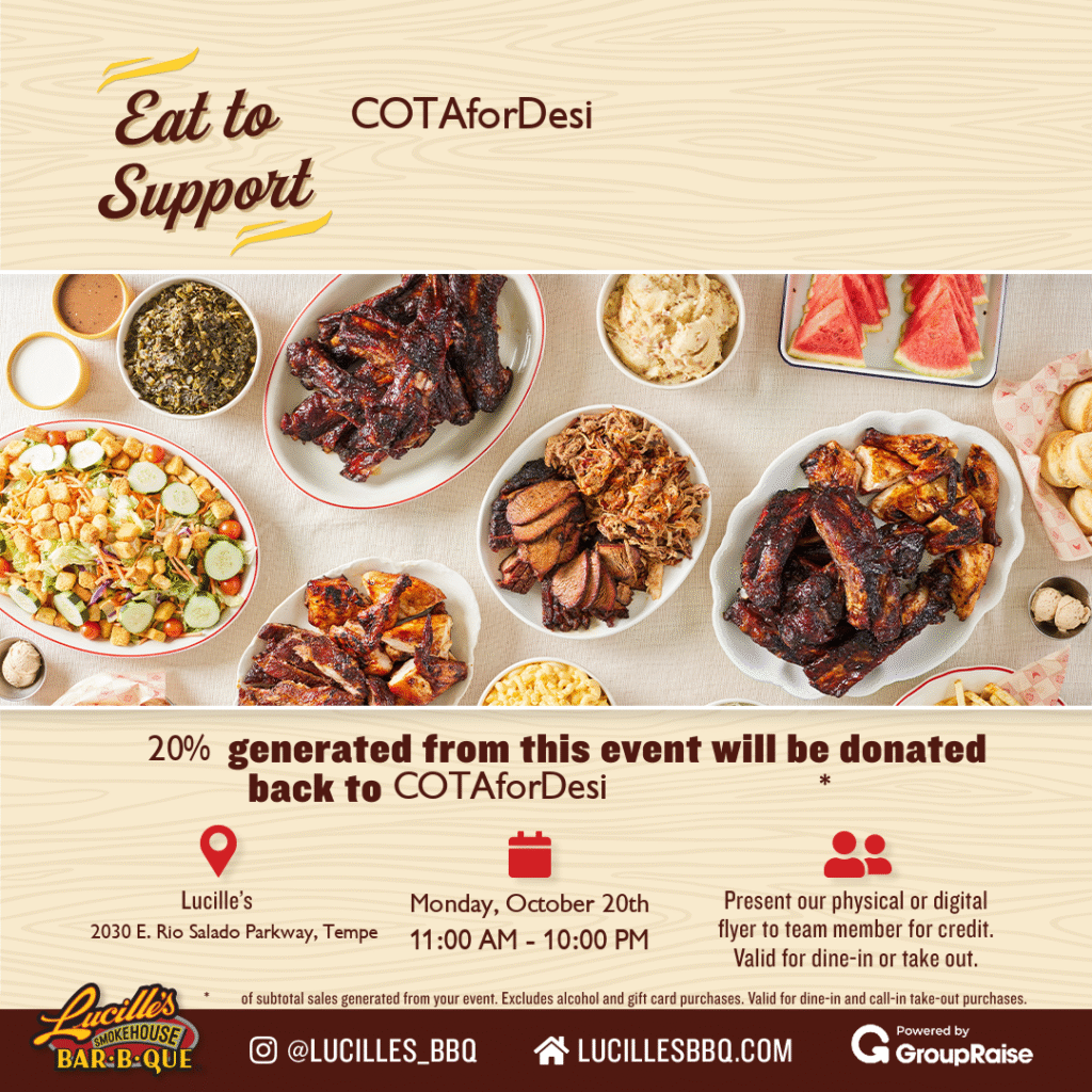 Fundraiser at Lucille’s BBQ at Tempe Marketplace — October 20th — supporting COTAforDesi!