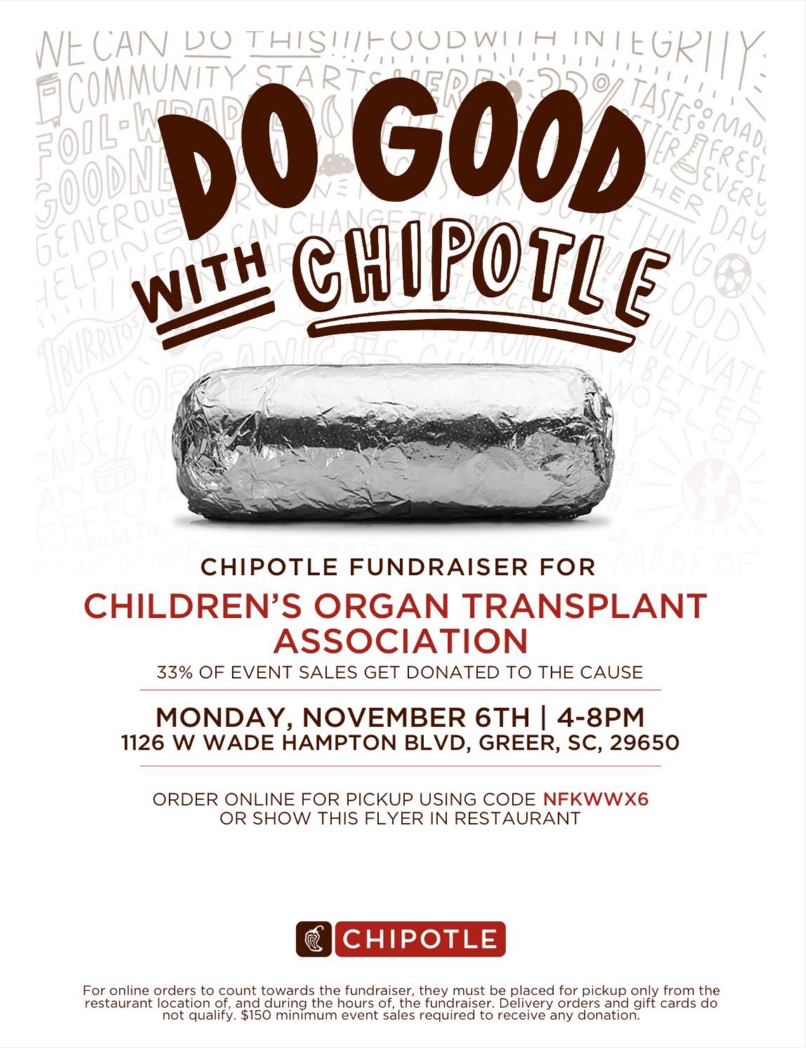 Google Calendar | iCal FeedJoin us for a profit share to support COTA in honor of Easton Morley. Come in to Chipotle at 1126 W Wade Hampton Ave in Greer, SC on Monday, November 6 between 4:00PM to 8:00pm. A portion of each sale will be donated to COTA in honor of Easton Morley.