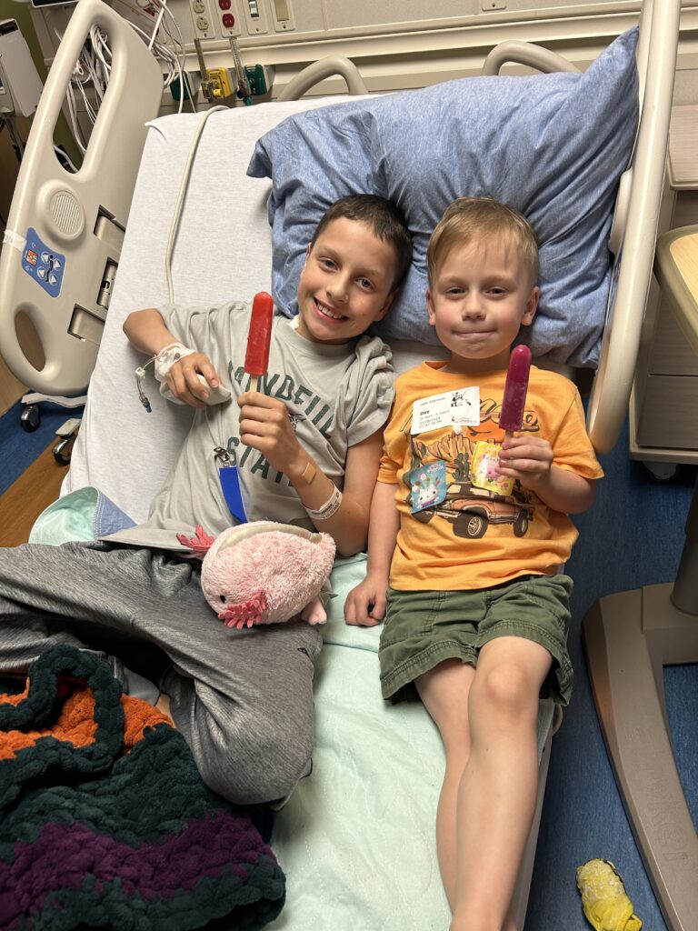 Jack tried eating again today. He kept it down a little longer but ultimately ended up losing his meal. We will just keep trying. Hopefully he can try to get some toast down before his food window closes. On the good news side, Jack got his neck catheter out today! He is down to just a stomach drain, his g/j feeding tube and an iv port on his wrist. He also has his insulin pump and CGM but that isn’t so uncomfortable.