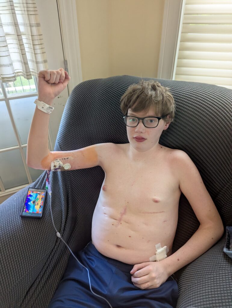 While the appointments went well, it was a difficult trip for Jake. His PICC line had moved and needed to be removed and replaced before he could leave the hospital. This meant having to return to the dreaded 7th floor and be put into a sterile room that reminded him of the surgery suite. He handled his nerves and the procedure with incredible strength and bravery. He was so happy to leave St. Louis and return home that evening. Now he is resting up for physical therapy today followed by a night of fun and games with friends.