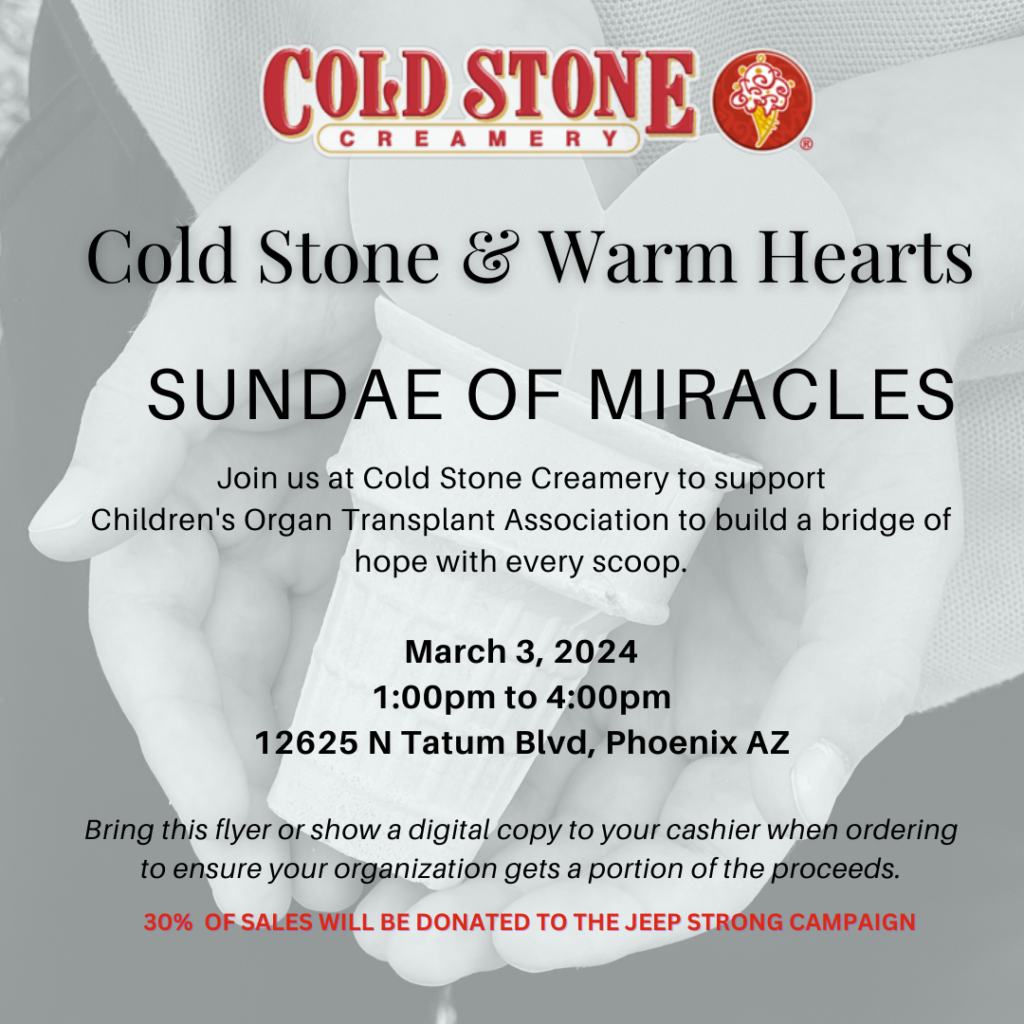 Google Calendar | iCal FeedJoin us at Cold Stone Creamery to support Children’s Organ Transplant Association.