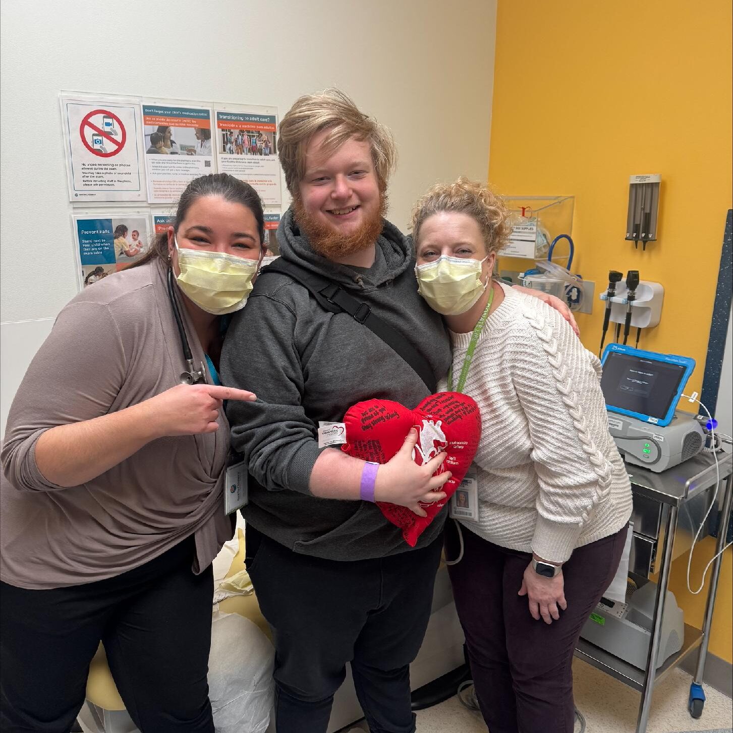 The amazing human to the left of Josiah is his main Cardiologist, Bethany Wisotzkey. She is forever curious and advocates for his care. Stephanie Church is to the right and is the Nurse VAD Coordinator. She is an incredible person, who is our go-to person for almost everything, as she helps the other departments support and care for him.