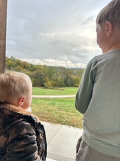 If you look closely between Eddie and Mac’s excited faces above the tree line is a rainbow. You may notice also the hills are of our home and not that of Pittsburgh.