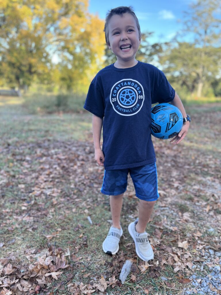 Thank you all for your continued prayers! Here’s a cute photo of Roman I took in his new CFC (Chattanooga Football Club) t-shirt: