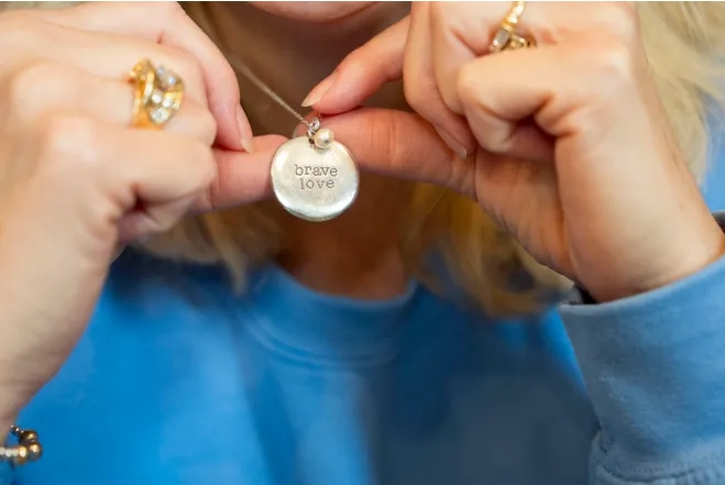 Motivational speaker Jada Daves of Chattanooga holds a neckless out with the words “brave love” at a Nashville apartment in Nashville, Tenn., Friday, May 16, 2025. She got the necklace after donating a kidney in 2011 to her then 20-month-old son, Shafer, who was born with a rare genetic disease that destroys kidneys