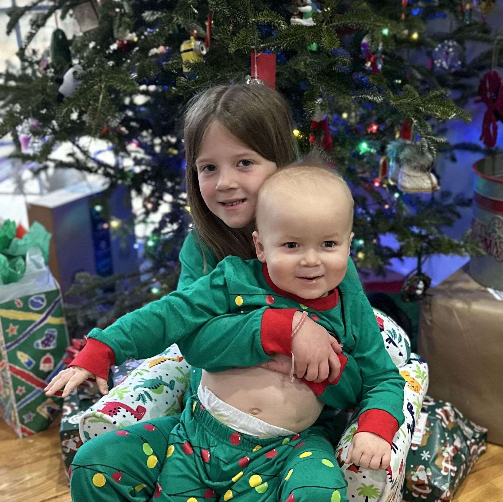 Big sister and Griffyn in his new dinosaur chair!