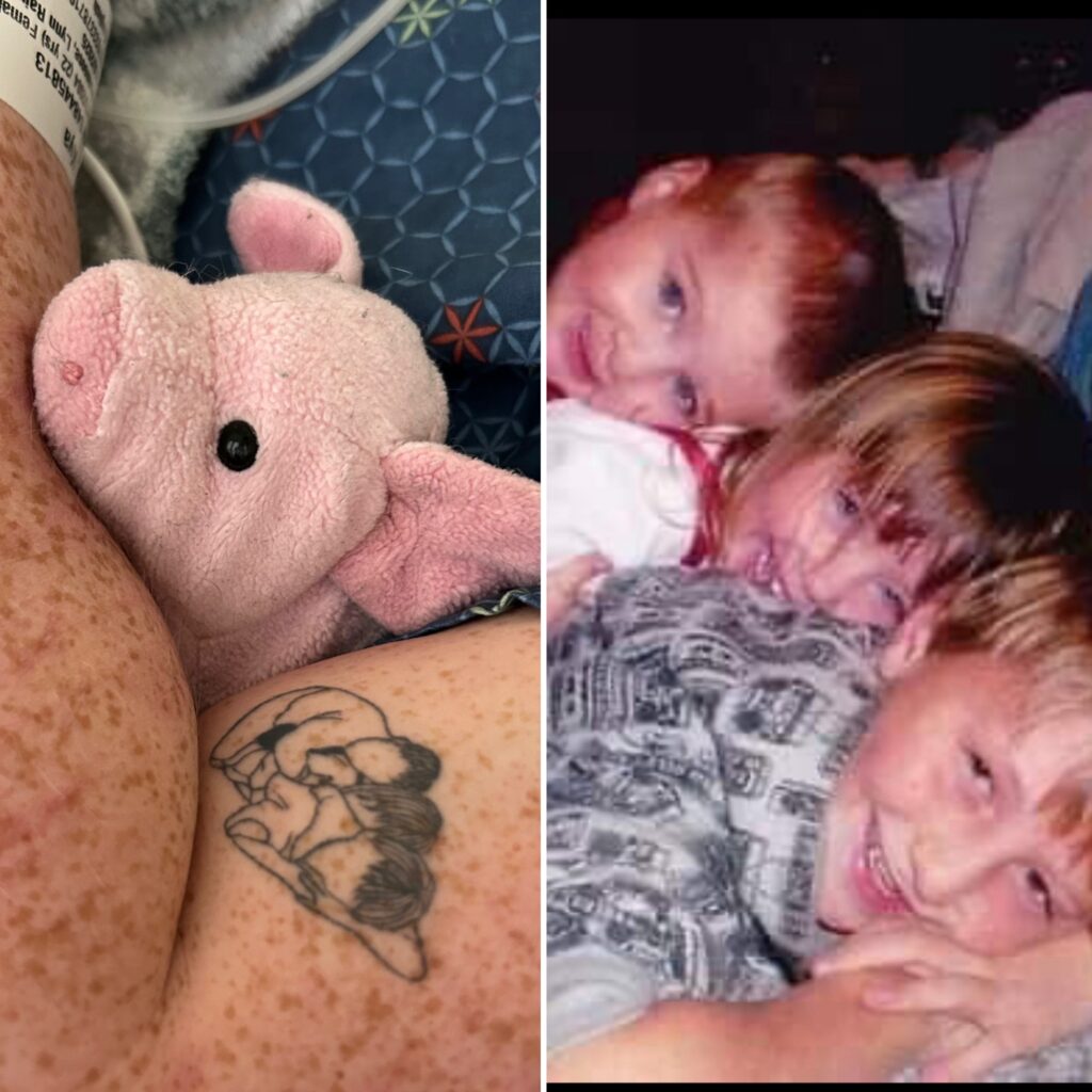 The tattoo – an outline of the pic: Kenny, Kya and Eli all stacked up watching TV