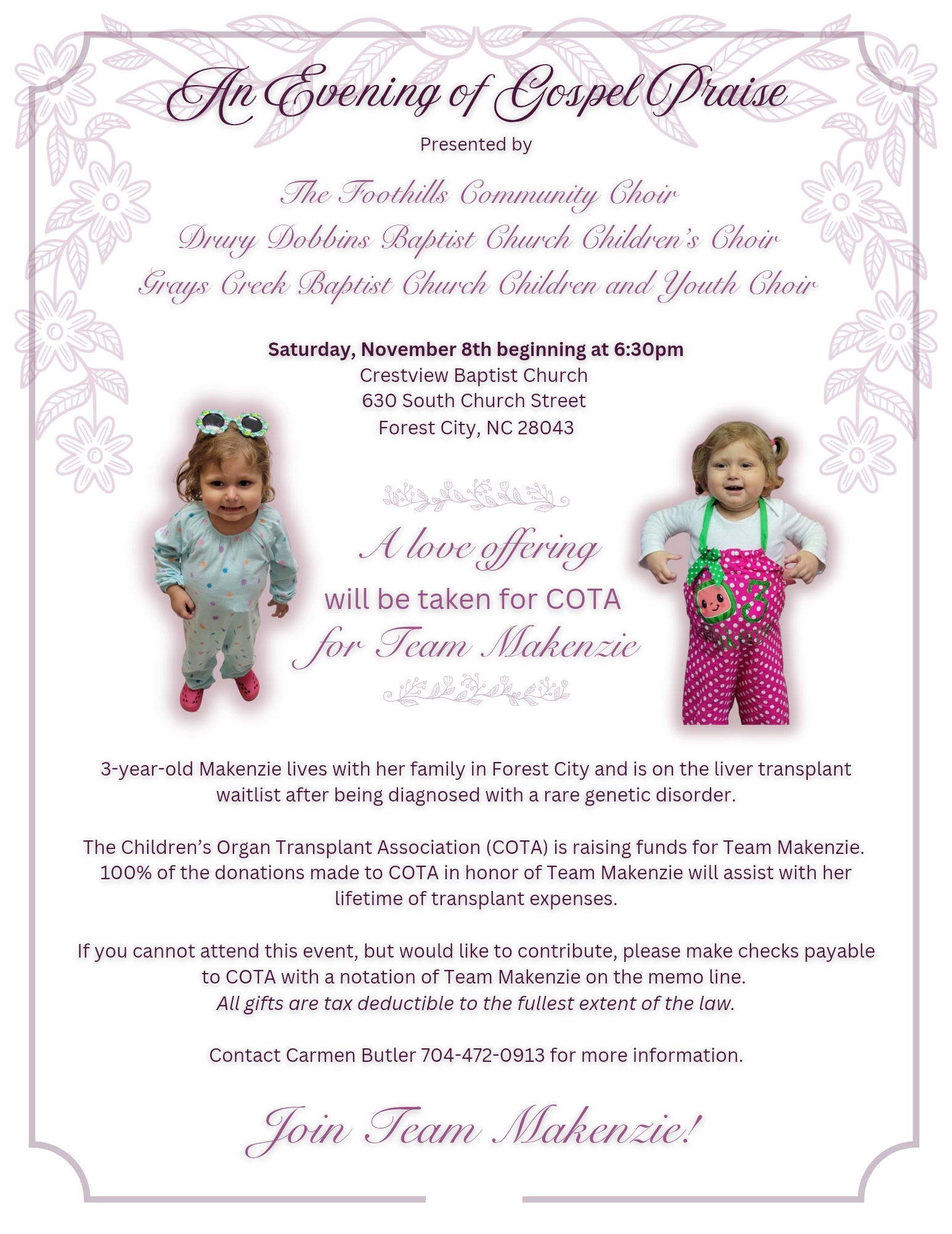 If you love to praise the Lord, hear amazing songs, and enjoy an evening of relaxation, we invite you to Crestview Baptist Church on November 8th. There will be three different choirs coming together to share their music with everyone. This is a free event, but a love offering will be taken up for COTA for Team Makenzie. All proceeds will assist with a lifetime of transplant related needs.