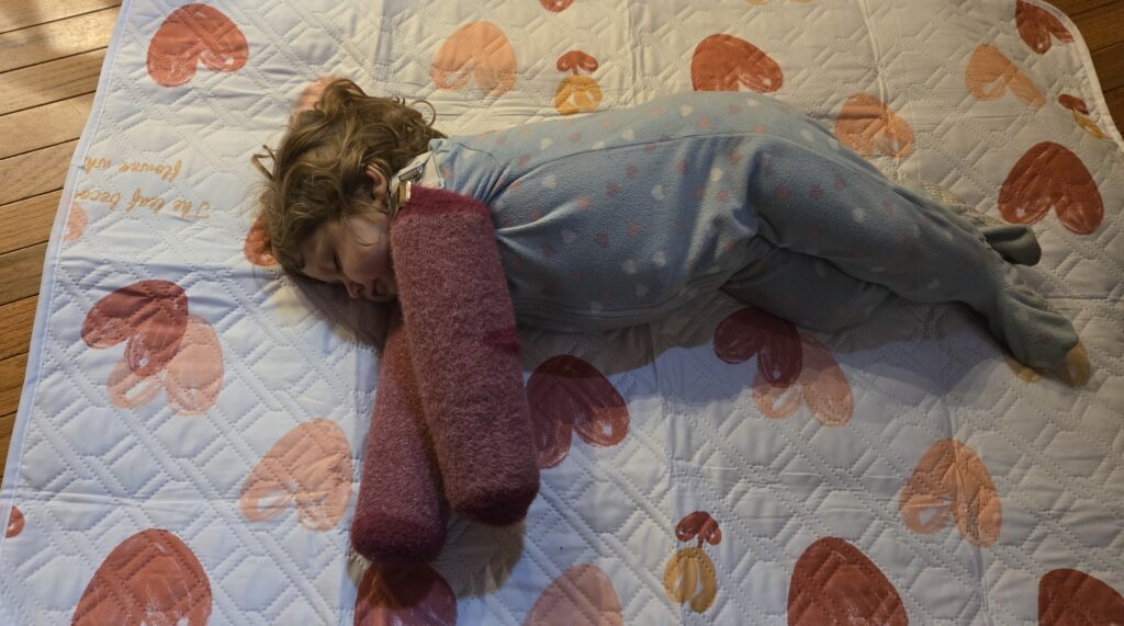Also, enjoy this picture of Makenzie who crashed on the floor at home after she got changed.