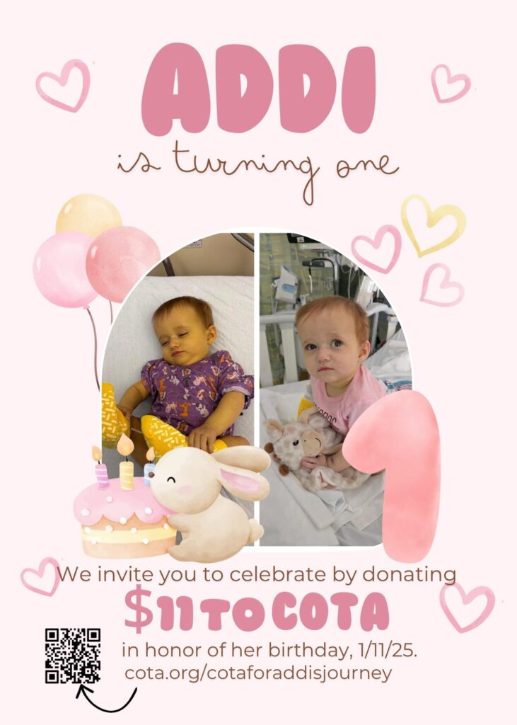 Social Media Challenge. Challenge followers to raise a certain amount of money in a single day; for instance, set a goal of $1,000 raised on your COTA patient’s transplant day. Ask for contributions in oddball amounts that have significance, like $11 in honor of your COTA patient’s birthday on the 11th. Supporters are more likely to round up their gift amount. (Remember, the minimum online gift amount is $5.) Or consider a Give It Up Challenge, where supporters choose something to give up for a period of time (such as no Starbucks for a week) and donate the money they saved to COTA in honor of your patient. A week’s worth of coffee is $25 for the COTA campaign!